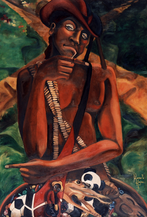 | MORE ABOUT THIS PIECE | Choice is a constant in all human lives. This could be the reason why deities like Elegba appear in so many belief systems as wise tricksters. He personifies choice, the boundary between prosperity and peril. In Yoruba-related religions, Elegba is represented by contrasts and contradictions: he is one of the the oldest deities and is a child, his colors are black and white (or red), and he enjoys cigars and rum as well as candy and toys. He sits at the crossroads and points in both directions.